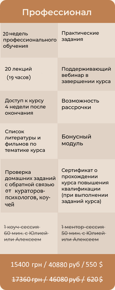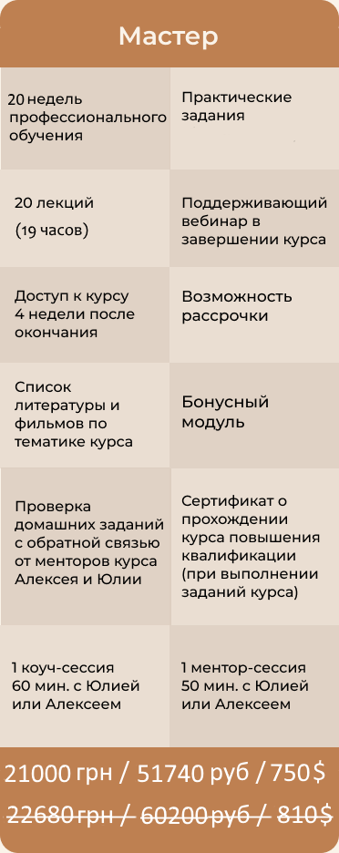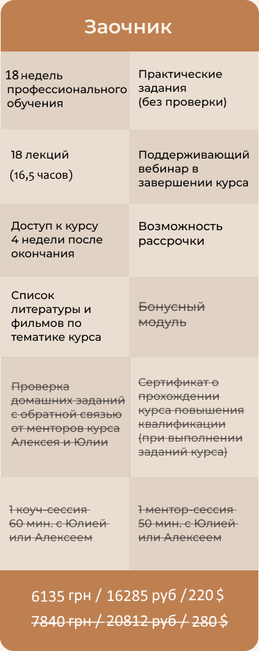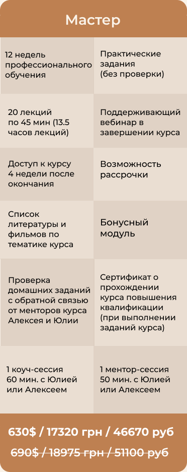 Вы выбираете сами: объем учебного материала; формат - с обратной связью или только лекции без обратной связи. Это важно для людей, активно занятых профессиональной деятельностью, чтобы программа не стала дополнительной нагрузкой, а органично встроилась в вашу жизнь.